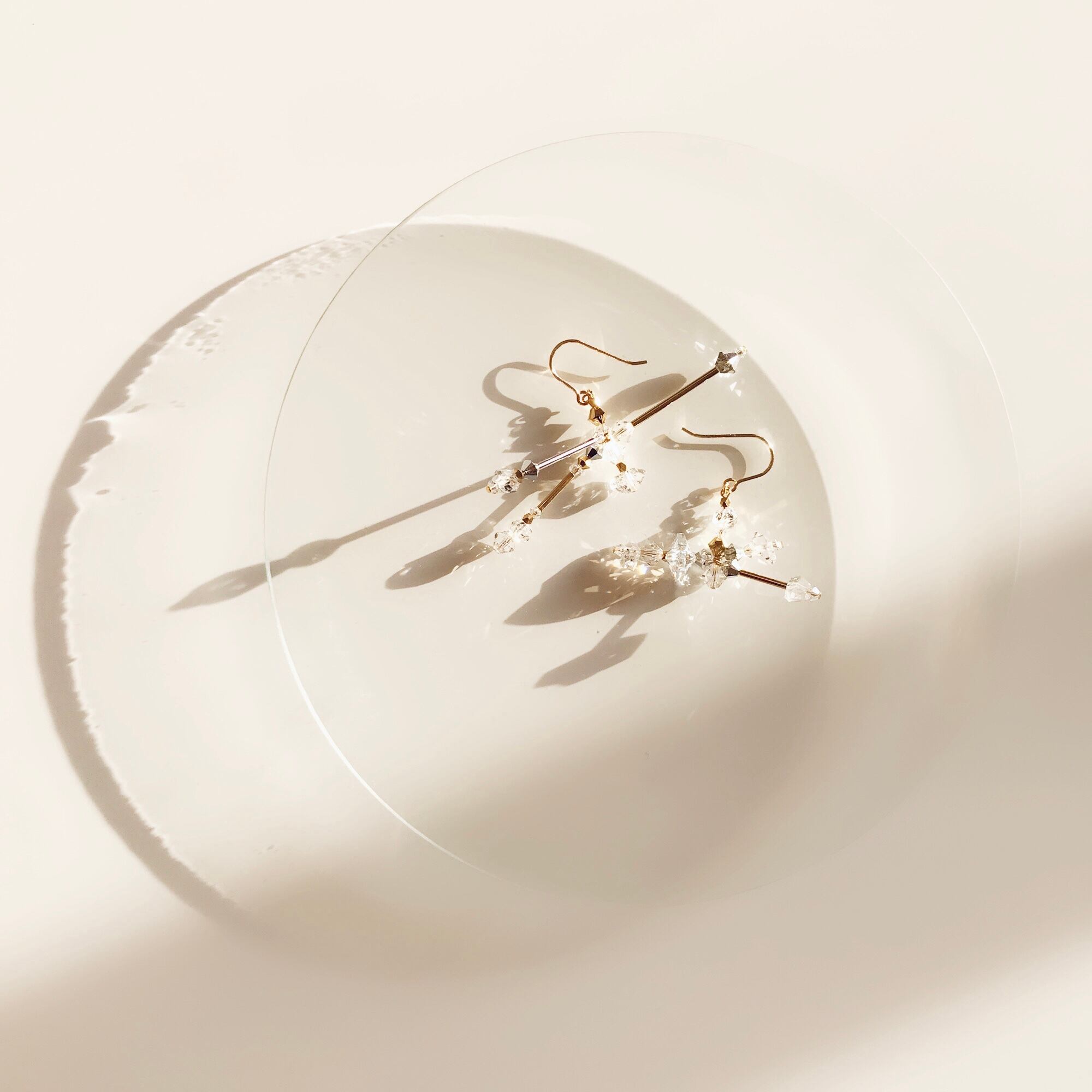 ※ このピアスのために選んだハーキマーダイヤモンドは、個体差がありますが5〜7mm大のものです。基本的に石のなかに炭素のこまかな黒点を内包しています。
